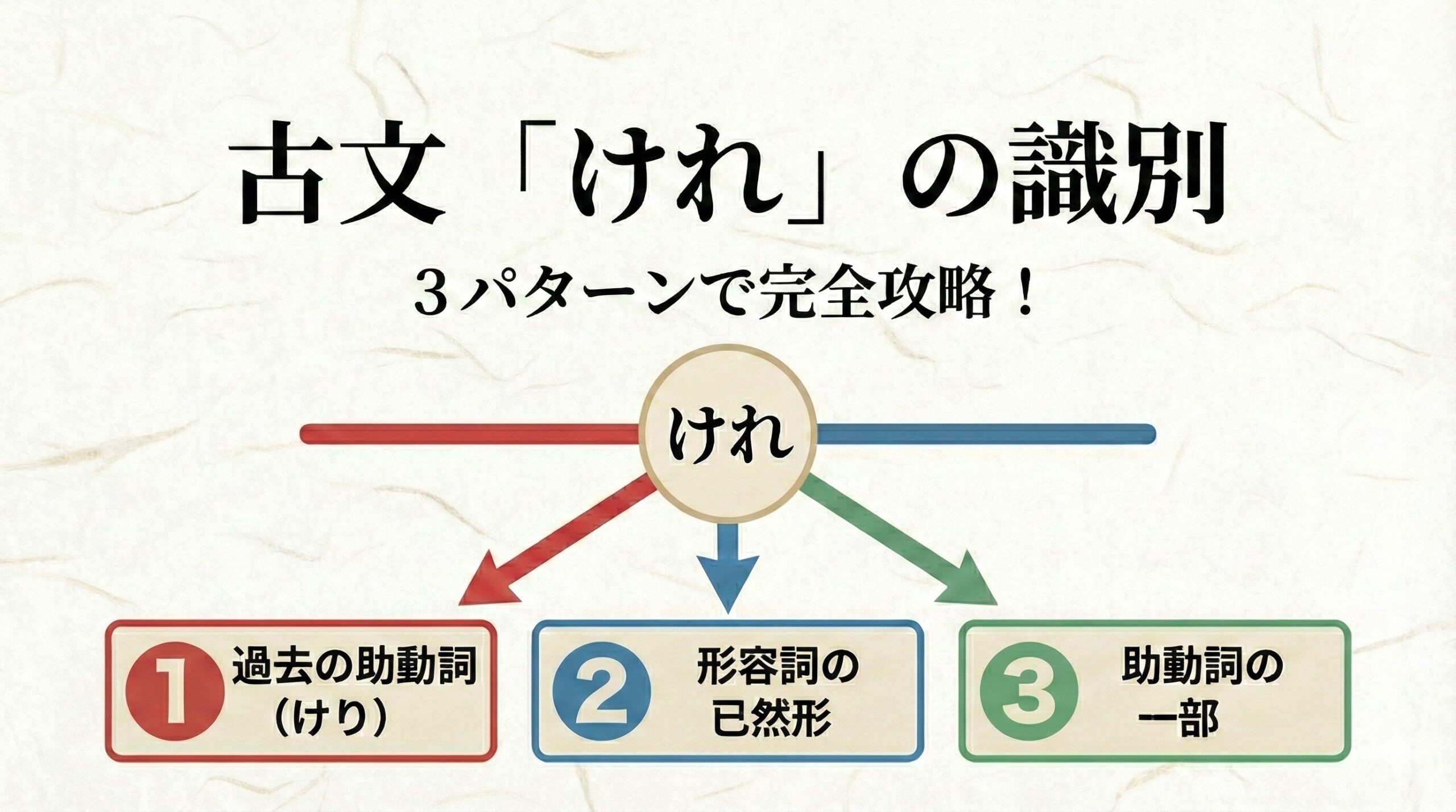 古文の「けれ」は、暗記で処理する語ではありません。形を順に確認するだけで、必ず判断できます。