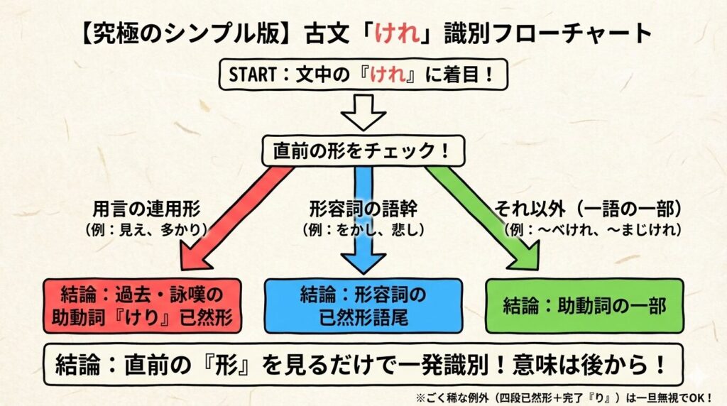 迷ったら、意味を考える前にフローチャートに戻ってください。この図を使えば、「けれ」の識別は確実に、そして速くできるようになります。
