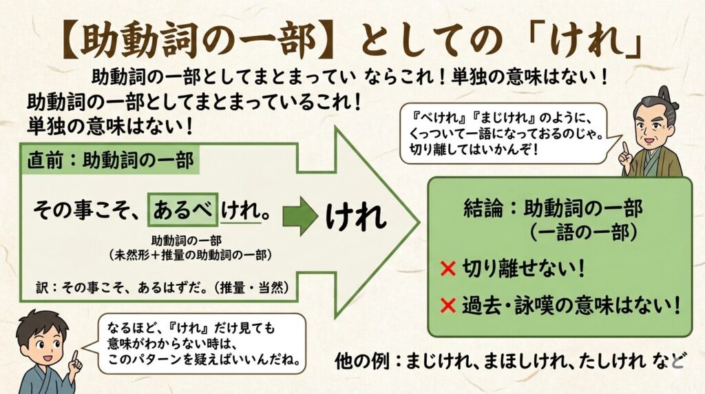 判断のポイントは、「けれ」だけを切り出して意味を説明できるかどうかです。意味を説明できない場合は、連語として一まとまりで扱います。