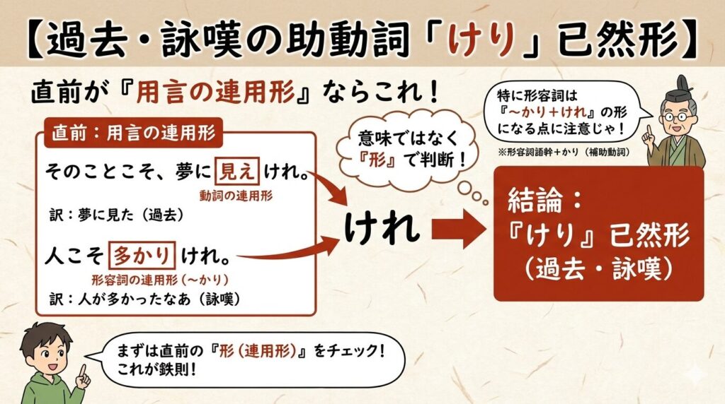 どちらの文でも、「見え」「多かり」は連用形です。この形が確認できるため、「けれ」は助動詞「けり」の已然形だと判断できます。