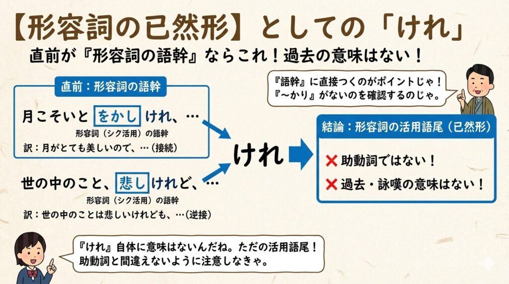 このタイプの「けれ」を助動詞と取り違えないことが、識別の重要なポイントです。