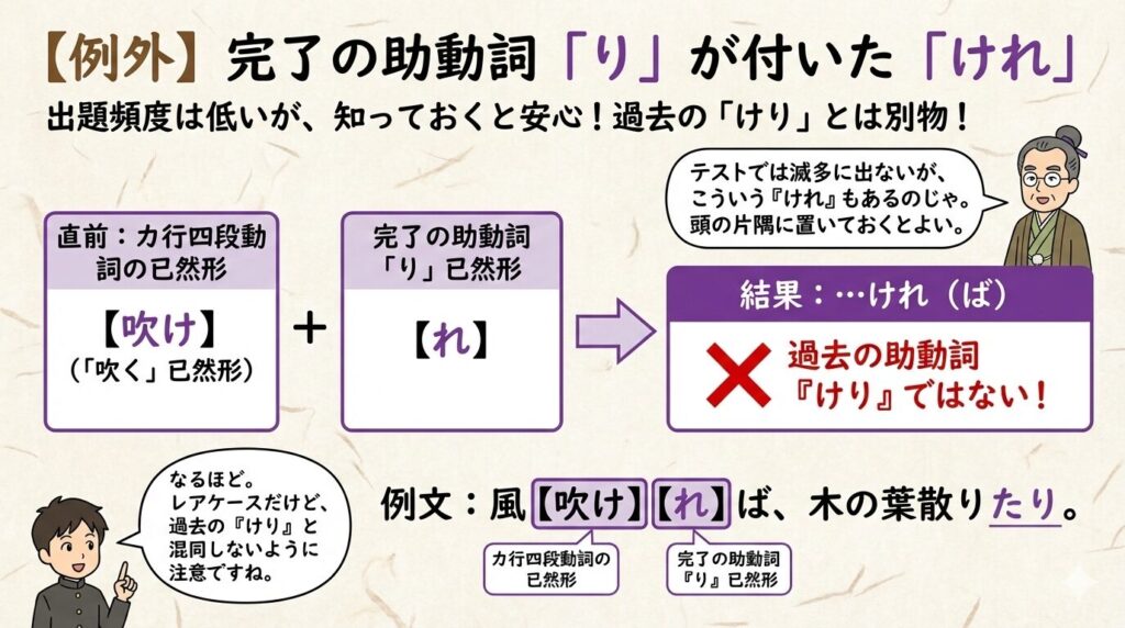それが、カ行四段動詞の已然形に、完了の助動詞「り」が付いた結果として現れる「けれ」です。この場合、形は「けれ」になりますが、過去の助動詞「けり」とは無関係です。