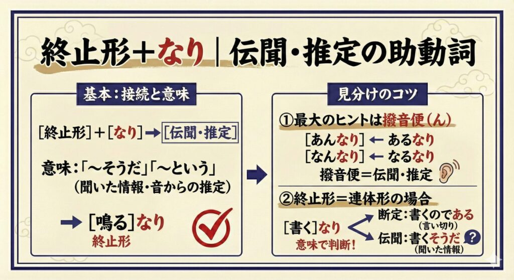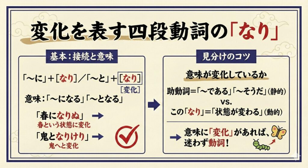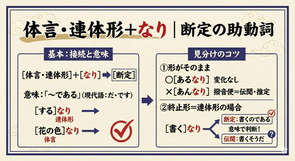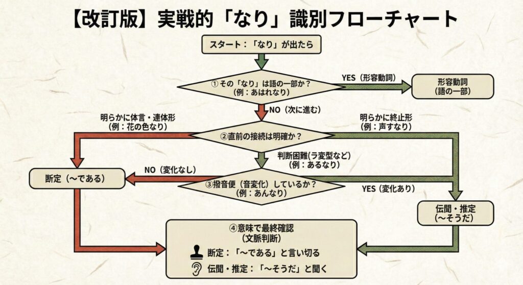 この記事では、図解フローチャートを使って「なり」の識別を徹底的にわかりやすく解説します。