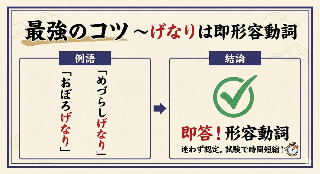 特に「〜げなり」は迷わず形容動詞確定。ここは即答レベルで大丈夫です。