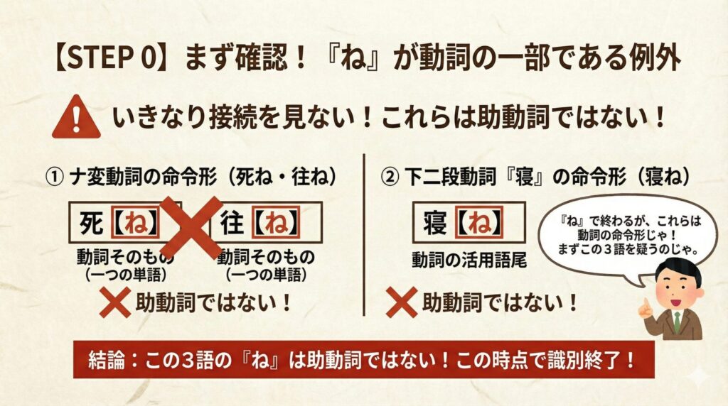 ナ変動詞の「往ね」「死ね」や、下二段活用の「寝ね」は、「ね」がくっついているように見えますが、一つの単語です。
