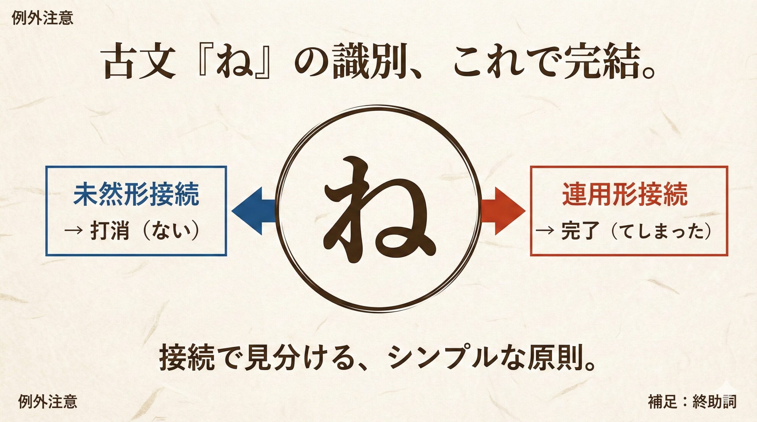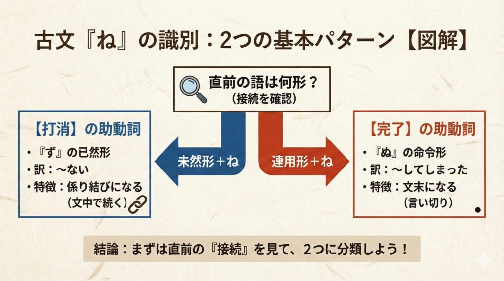 なお、完了の「ね」は活用形が命令形になる点が特徴です。まずは図解で全体の流れを確認し、識別の型を頭に入れましょう。