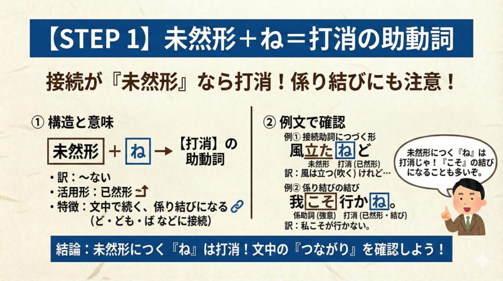 古文の「ね」は、助動詞「ぬ」と同じ手順で識別します。まず見るべきポイントは、「ね」がどの活用形に接続しているかです。