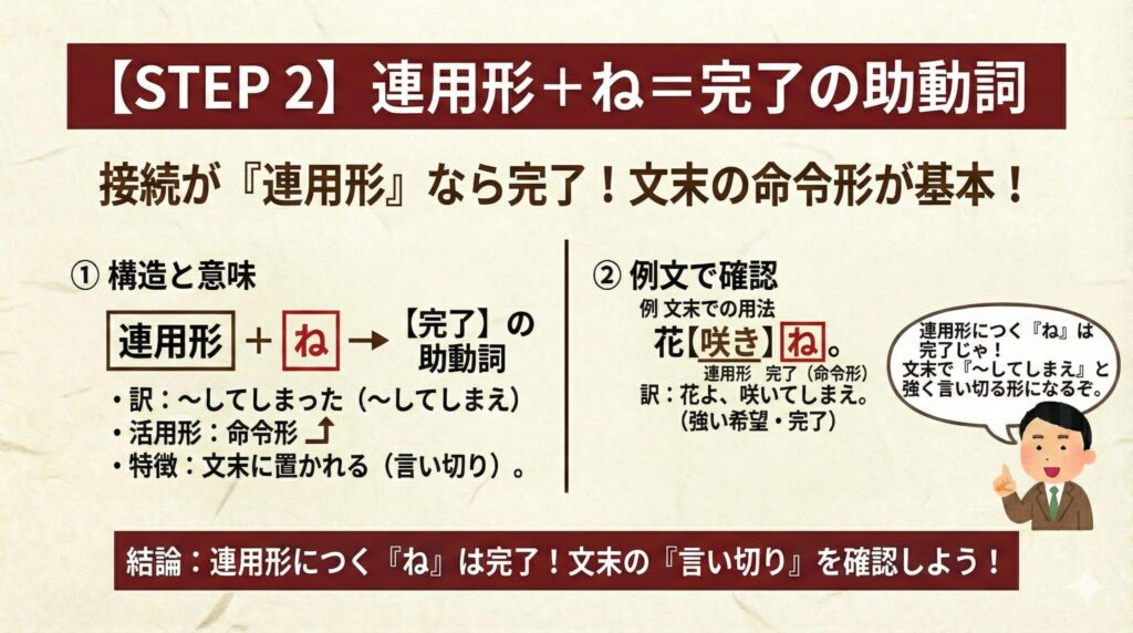 完了の「ね」は文末に置かれ、活用形が命令形になります。